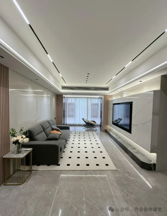 (2)无主灯做了,大规格瓷砖也用了,石材造型木格栅也做了,结果效果怎么看,都没有高级感!