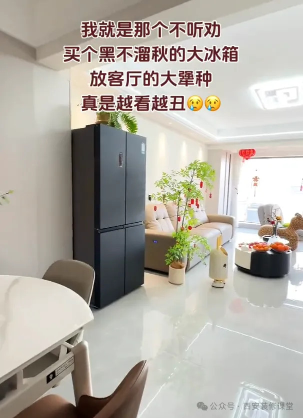 网友@平衡姐:当初装修的时候很多人都劝我把冰箱放厨房,我就是个不听劝的大犟种,把厨房冰箱位置改造了,非要放客厅,放客厅也就算了还要买个黑不溜秋的大家伙,真是越看越丑