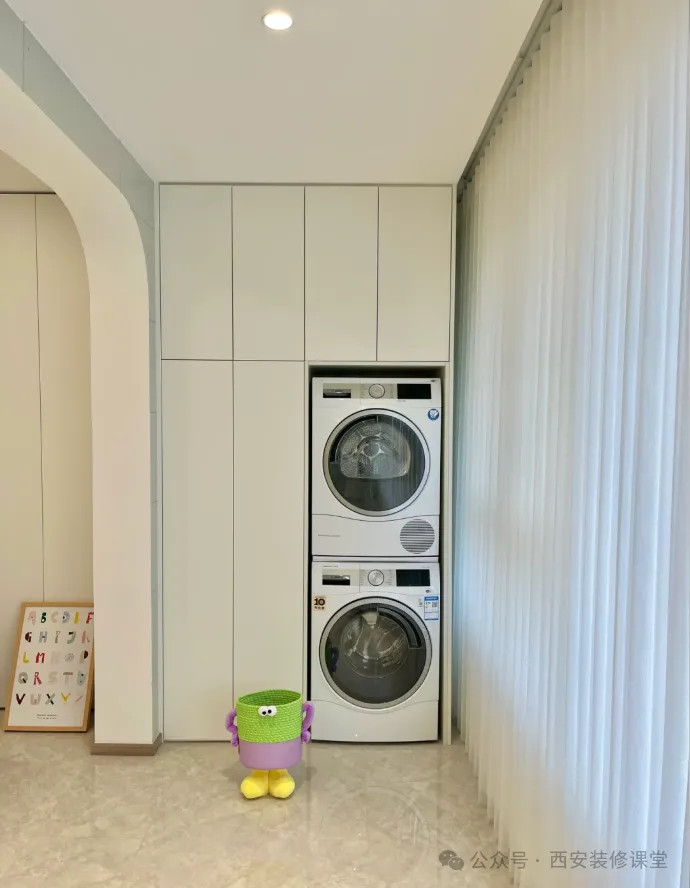封闭阳台贴了墙砖,也做了哑口套,没有原因,就是跟风,结果只放了洗衣机,烘干机太贵了。