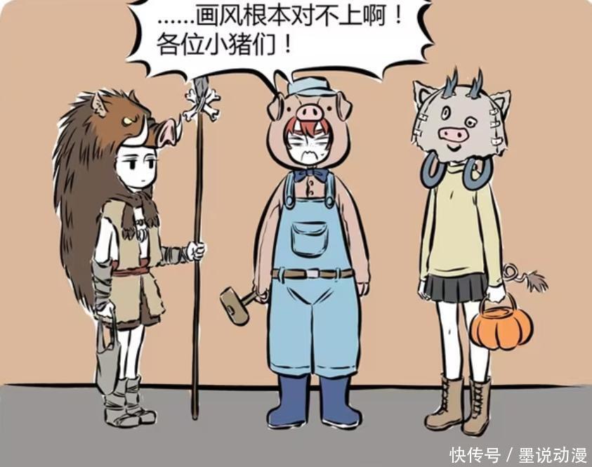 只有红孩儿用心准备,起码很符合《三只小猪》的设定,可是其他两只小猪就不一样了,哪吒直接cos野猪,看起来还是刚去深山狩猎野猪回来,用野猪皮毛披在身上。龙女更加敷衍,随便缝了个小猪面具就完事。