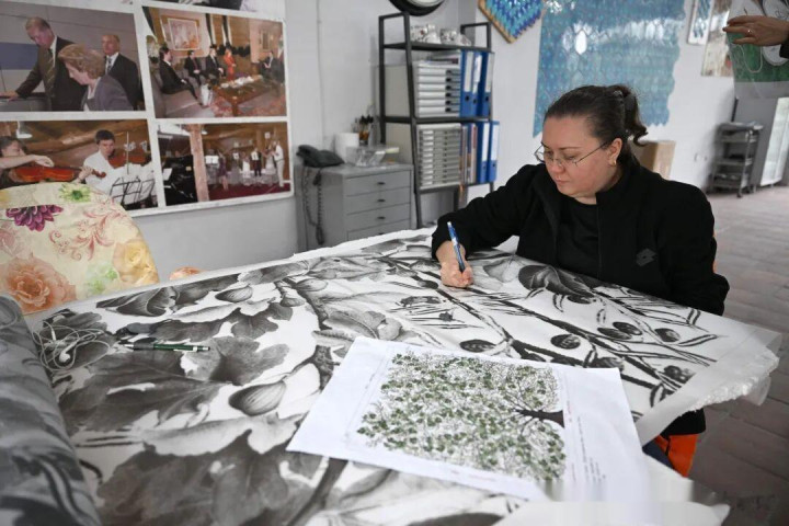 在一间宽敞的上层工作室里,架子上摆满了各色颜料罐,从浓郁的钴蓝、祖母绿到珊瑚红一应俱全。十几名女工正坐在这里绘制瓷砖,或是将图案转印到素白的餐具上。